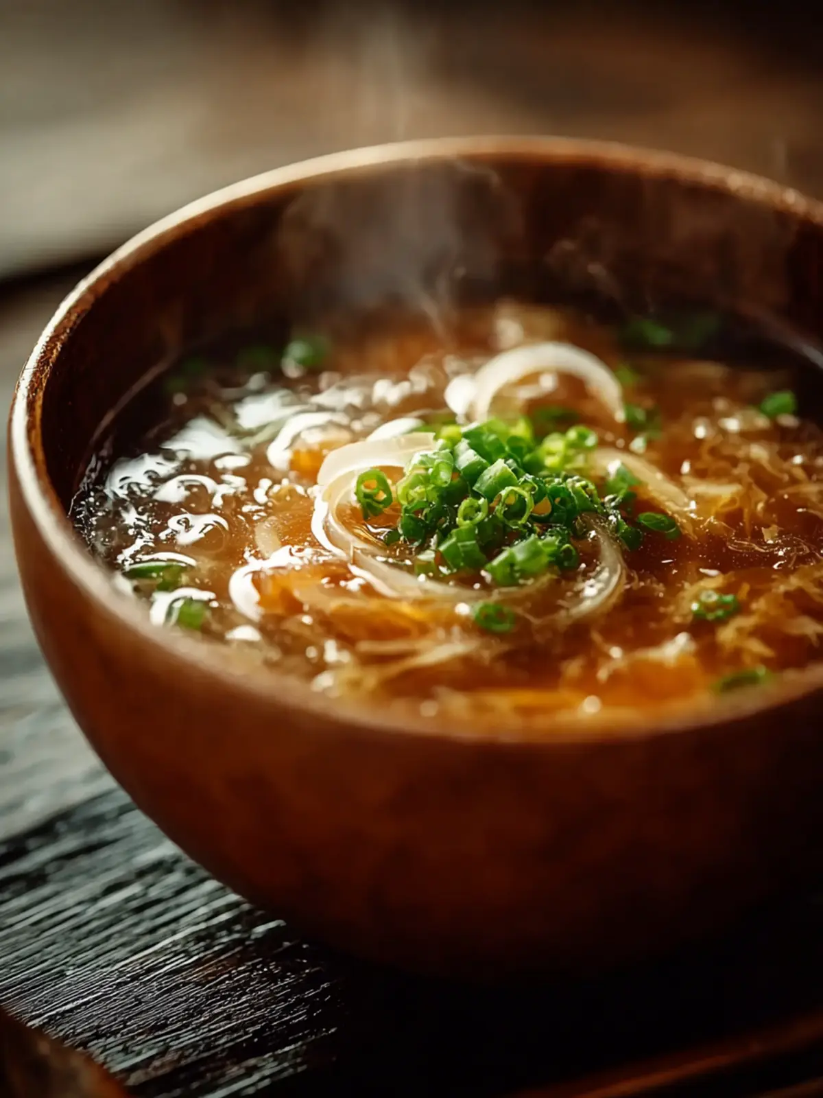 Dashi Broth: Instead of a heavy cream base, dashi — a traditional Japanese stock made from kelp and bonito flakes — infuses the soup with a light yet complex taste. It serves as the perfect backdrop for the sweetness of caramelized onions, enhancing their natural flavors.