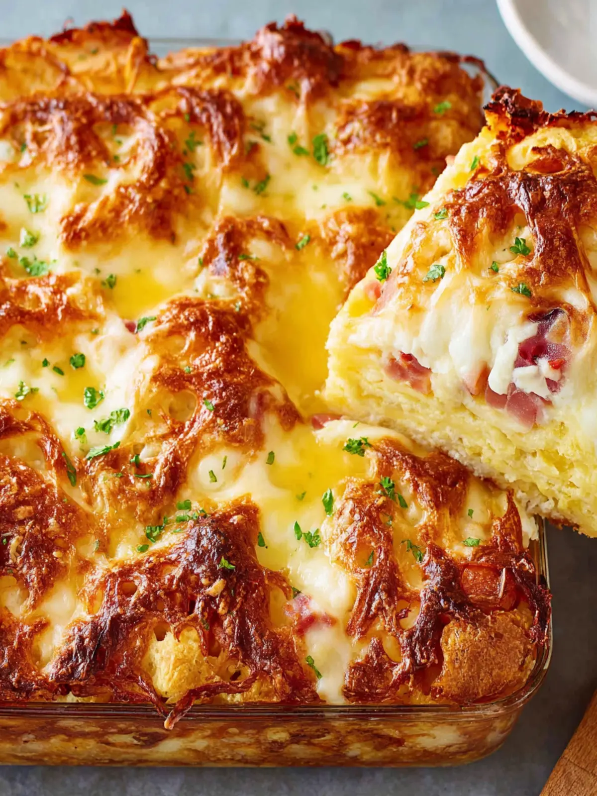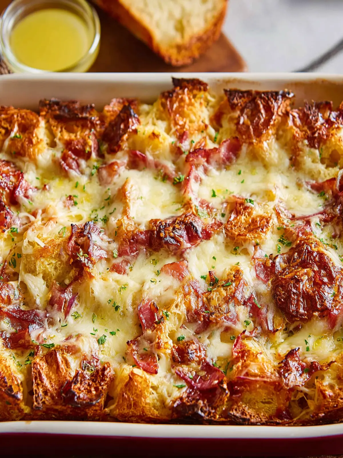 A delicious baked casserole featuring layers of bread, ham, and cheese, perfect for breakfast or brunch.