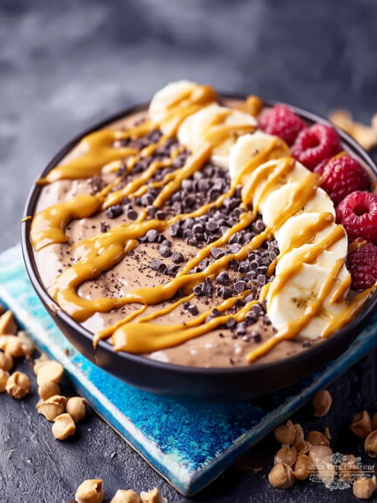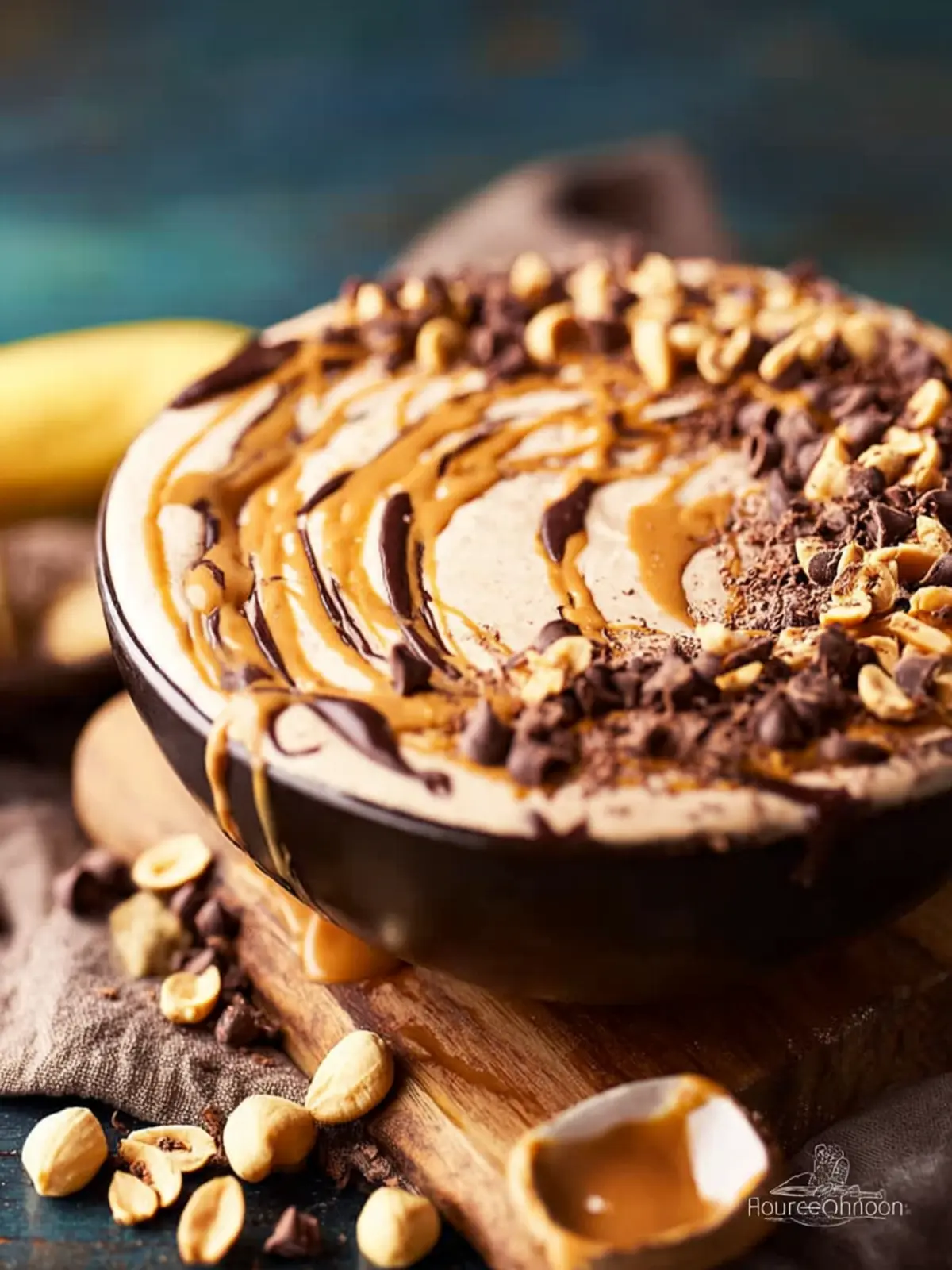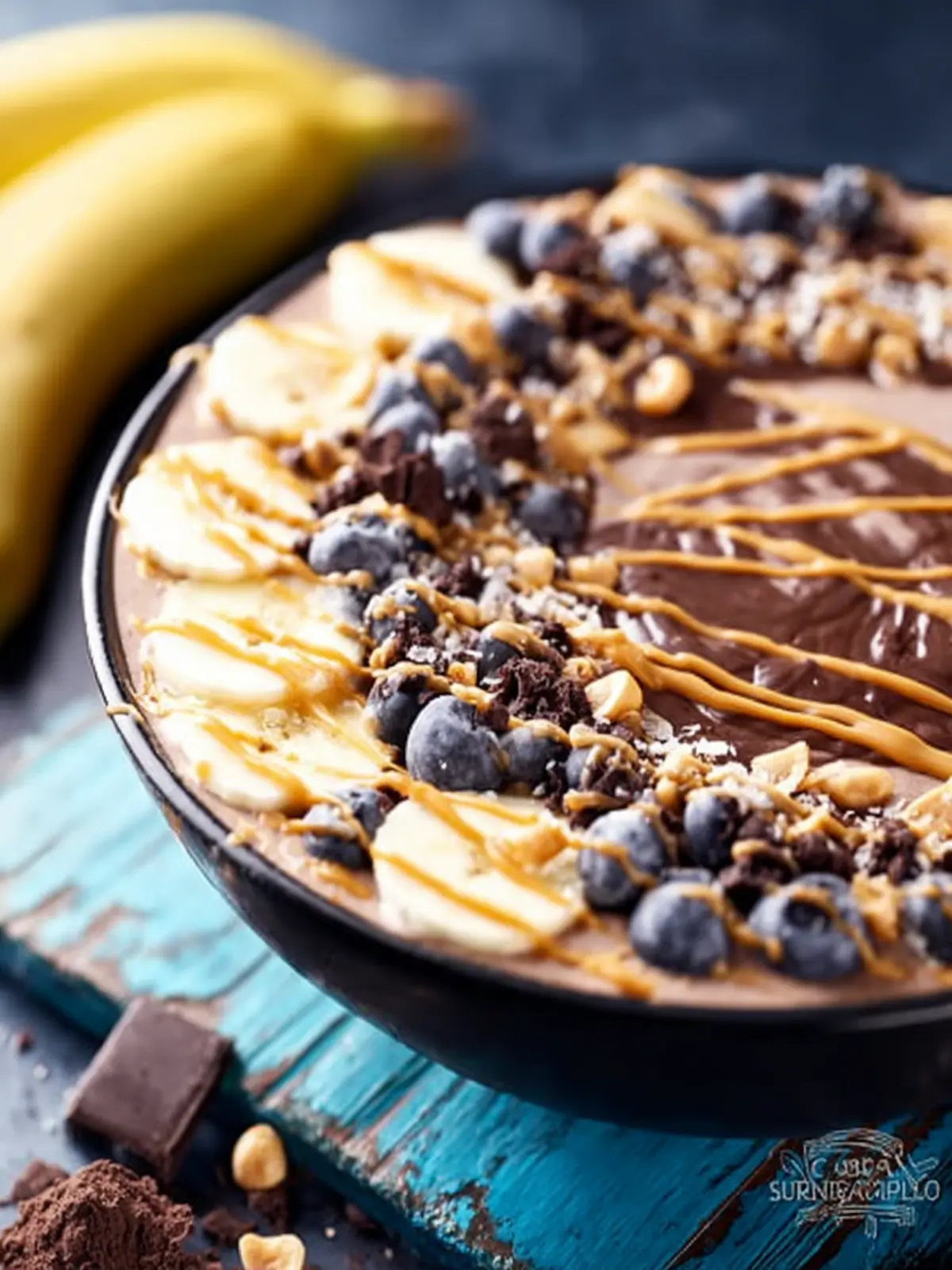 A delicious smoothie bowl made with bananas, peanut butter, and chocolate, topped with your favorite ingredients.
