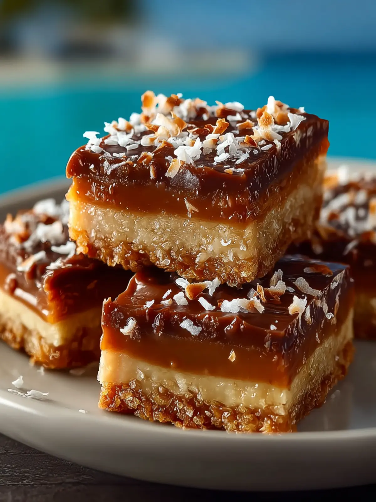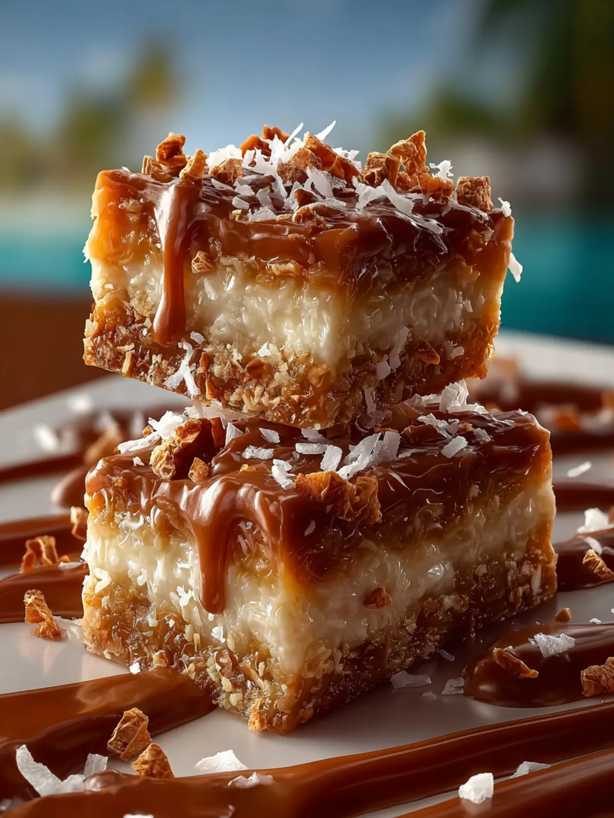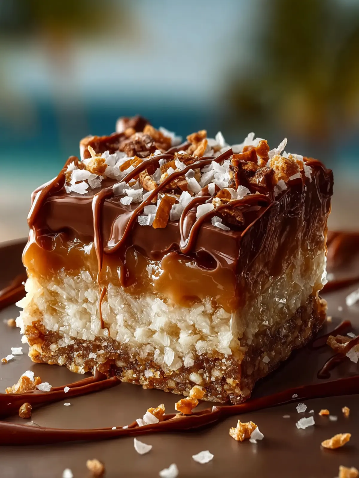 It’s not just the taste; it’s the textures that create an unforgettable eating experience. Each bar begins with a crunchy toffee base, layered with toasted coconut, then finished with a smooth, creamy topping. This mixture of sweet, nutty, and buttery flavors is hard to resist!