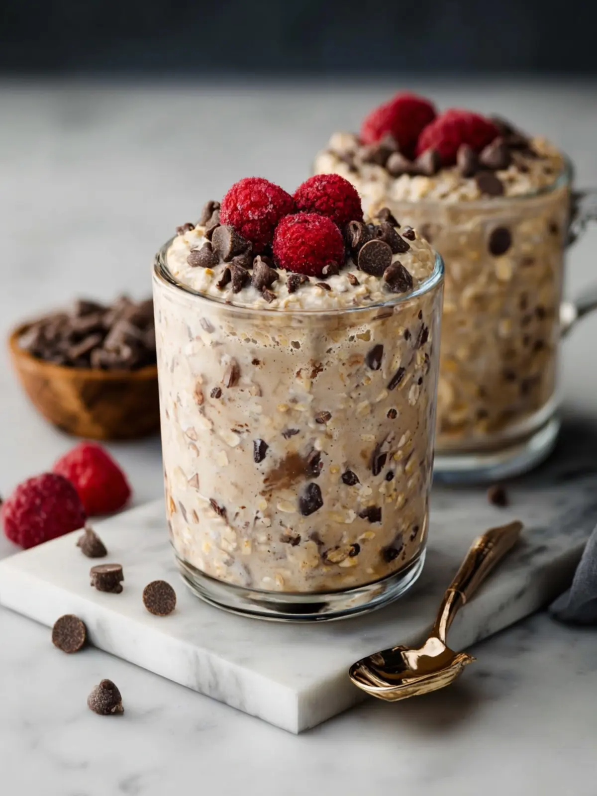 A delicious and nutritious overnight oats recipe with vanilla protein powder, chia seeds, and chocolate chips.