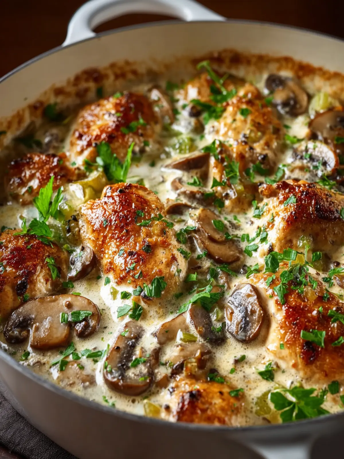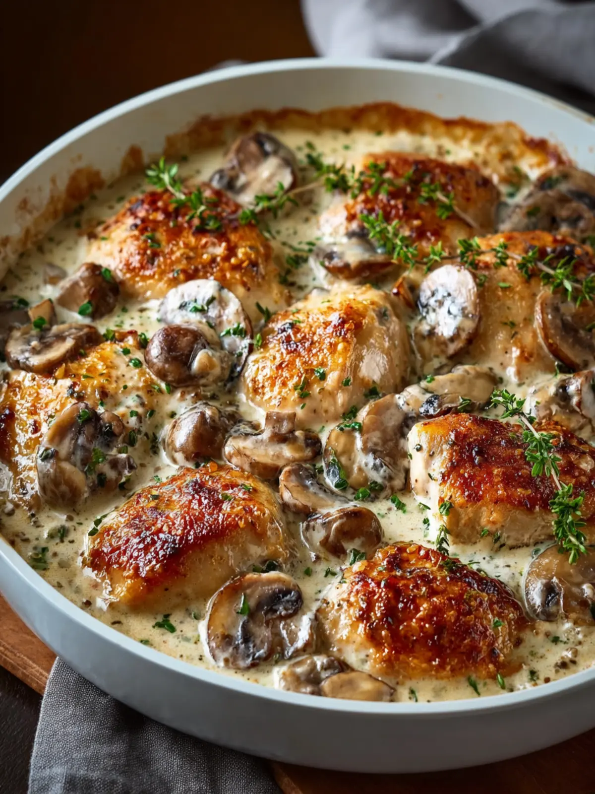 A deliciously creamy chicken dish topped with mushrooms and parmesan, perfect for a cozy dinner.