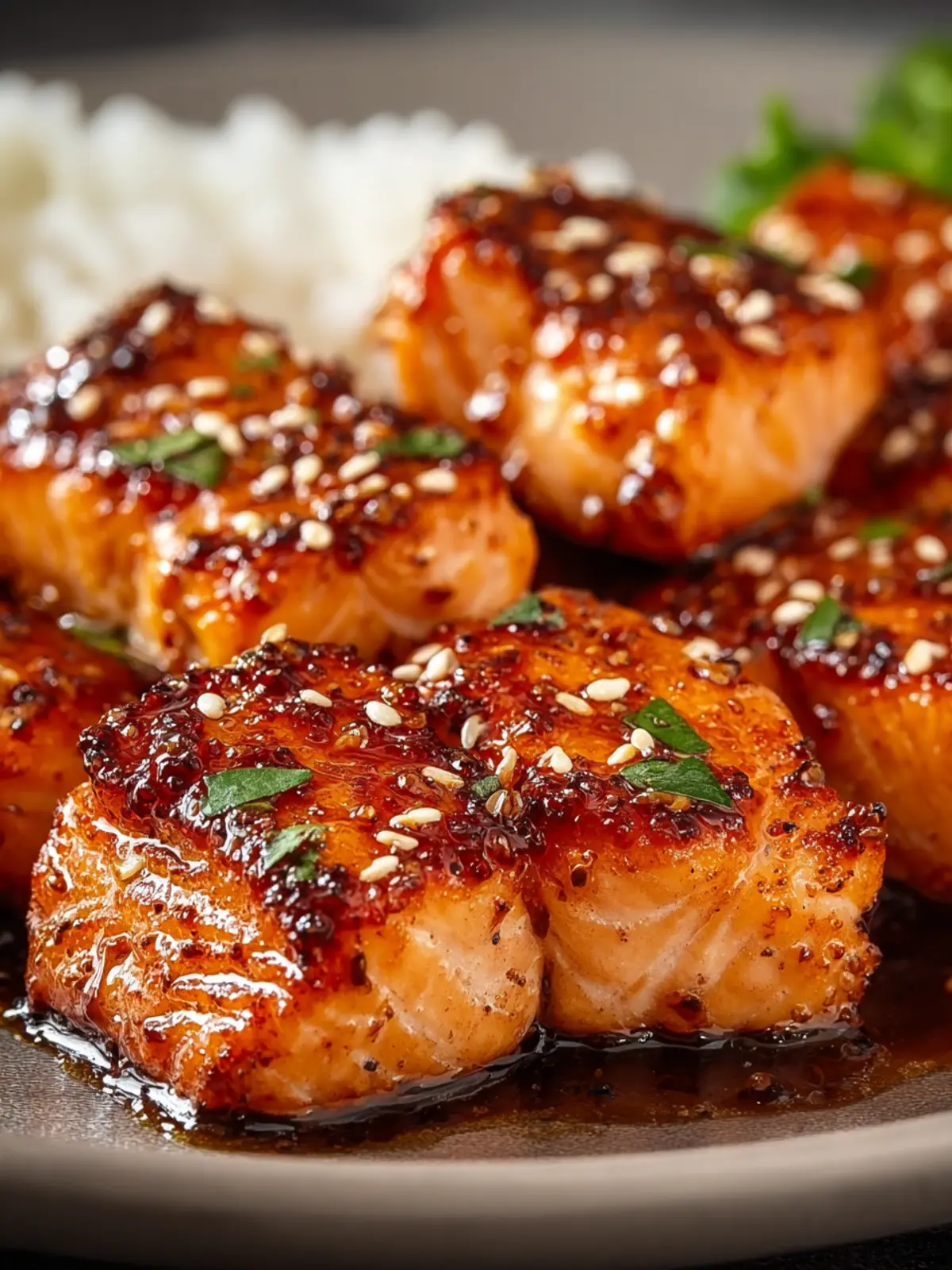 Delicious bite-sized salmon pieces coated in a sweet and savory honey garlic sauce.