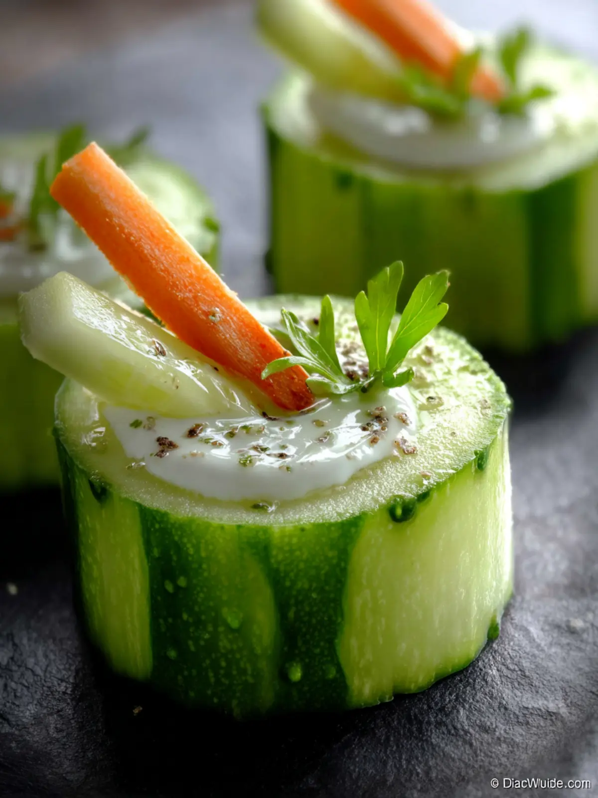 Refreshing cucumber cups filled with creamy ranch dip, perfect for parties or a light snack.