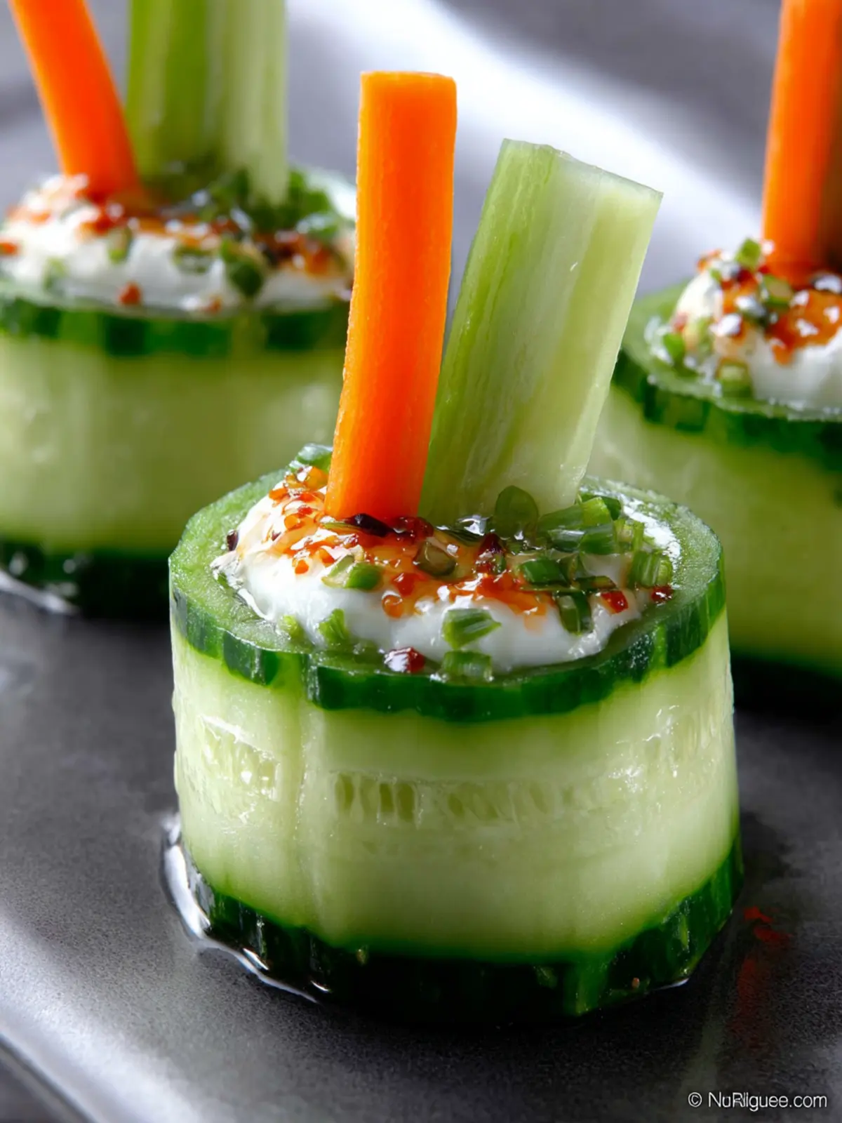 - Fill each cucumber cup with dip and insert a carrot and a celery stick.