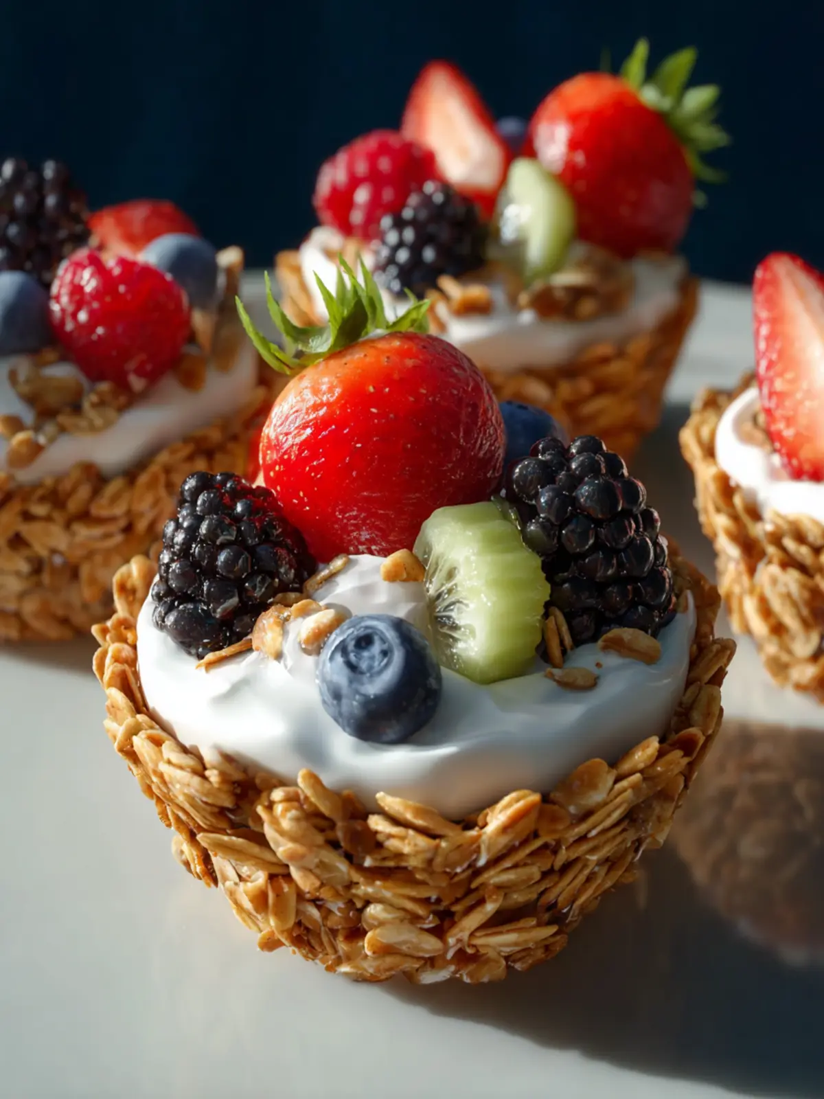 These delicious granola cups are perfect for breakfast or a snack, topped with yogurt and fresh fruit.