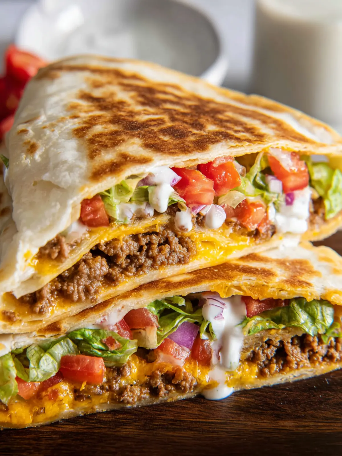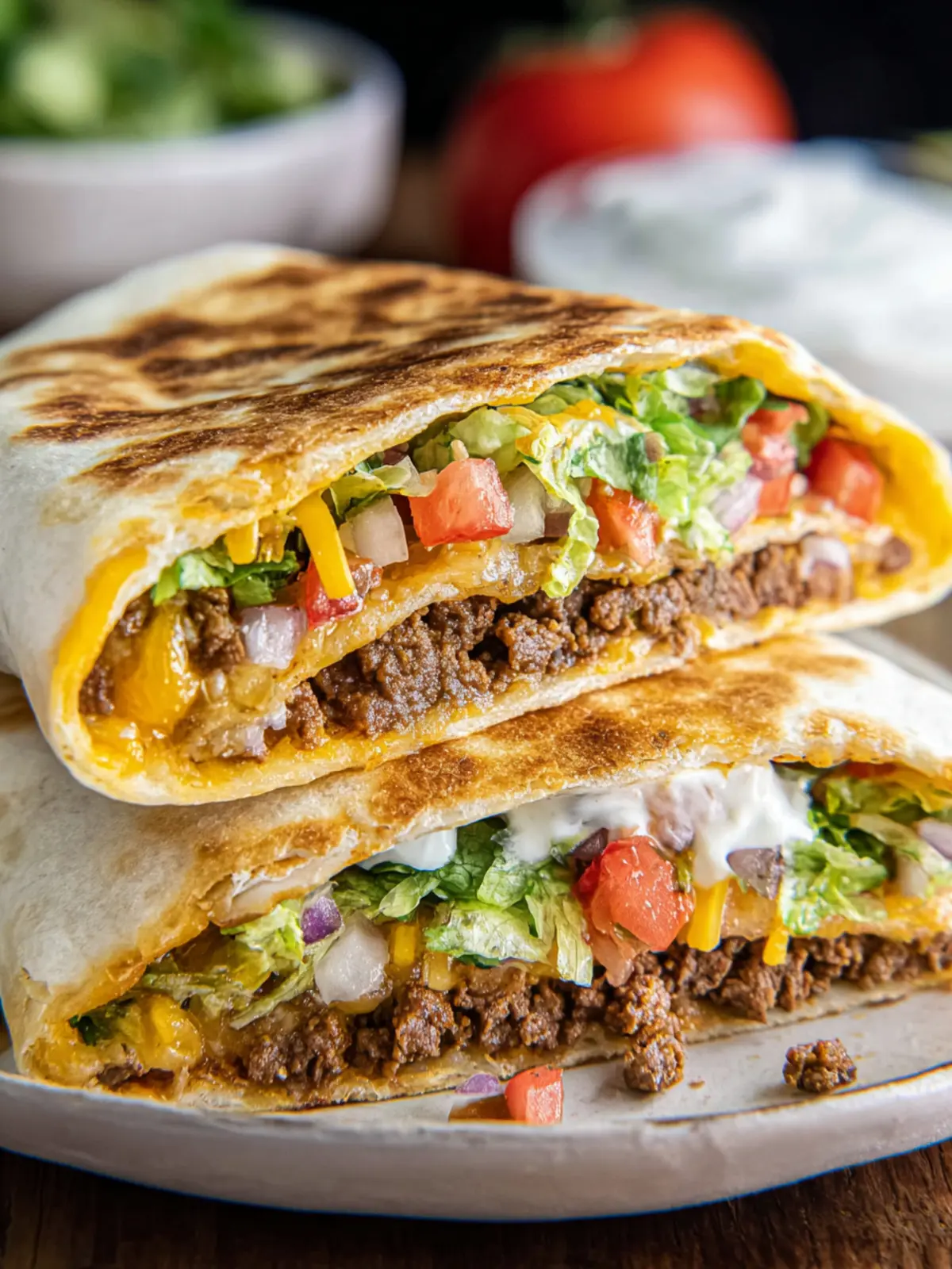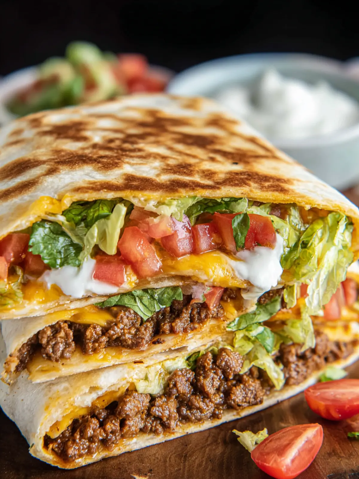 A delicious and easy-to-make Crunchwrap Supreme filled with savory ground beef, fresh vegetables, and creamy sauces.