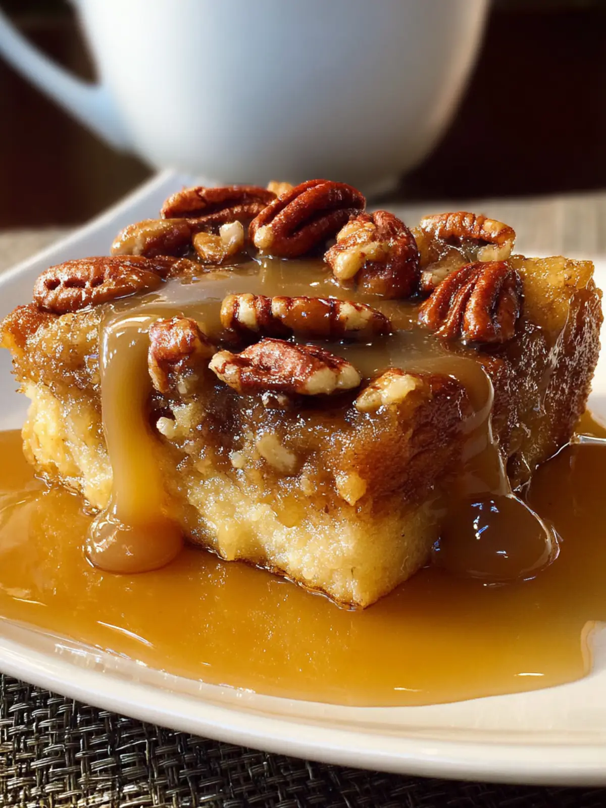 - Drizzle warm praline sauce over the baked pudding before serving.