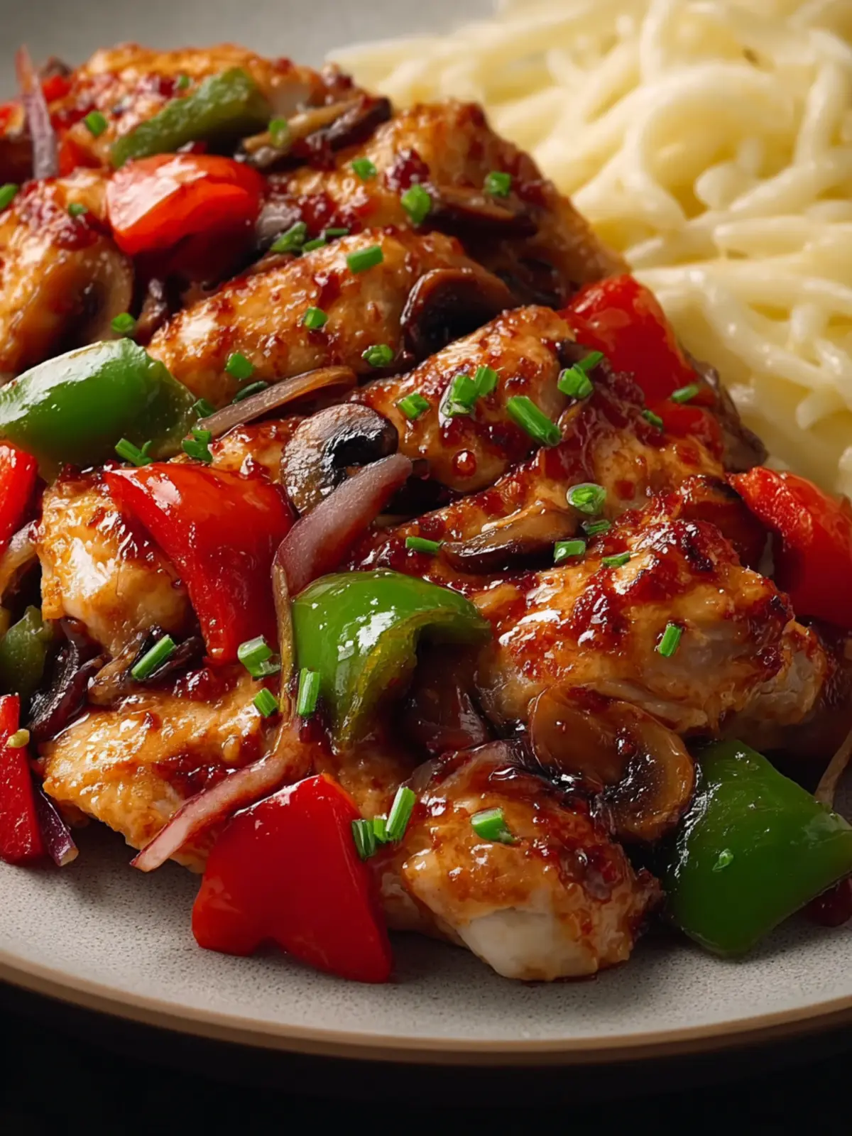 This delicious stir-fry features tender chicken strips with vibrant bell peppers and mushrooms, perfect for a quick weeknight dinner!