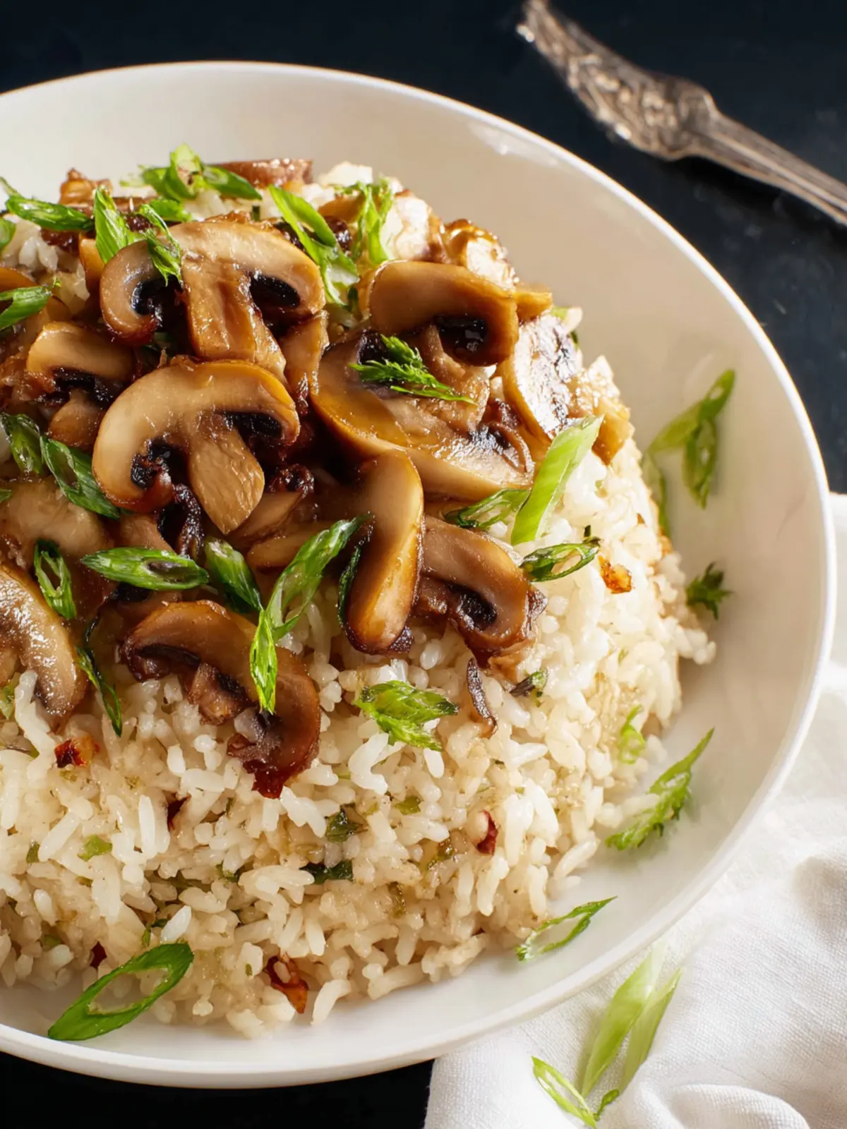 A delicious and easy mushroom rice recipe cooked with garlic and green onions.
