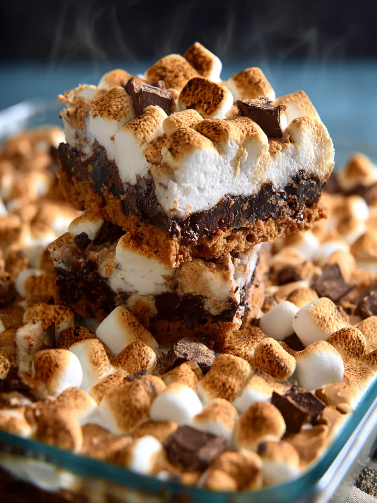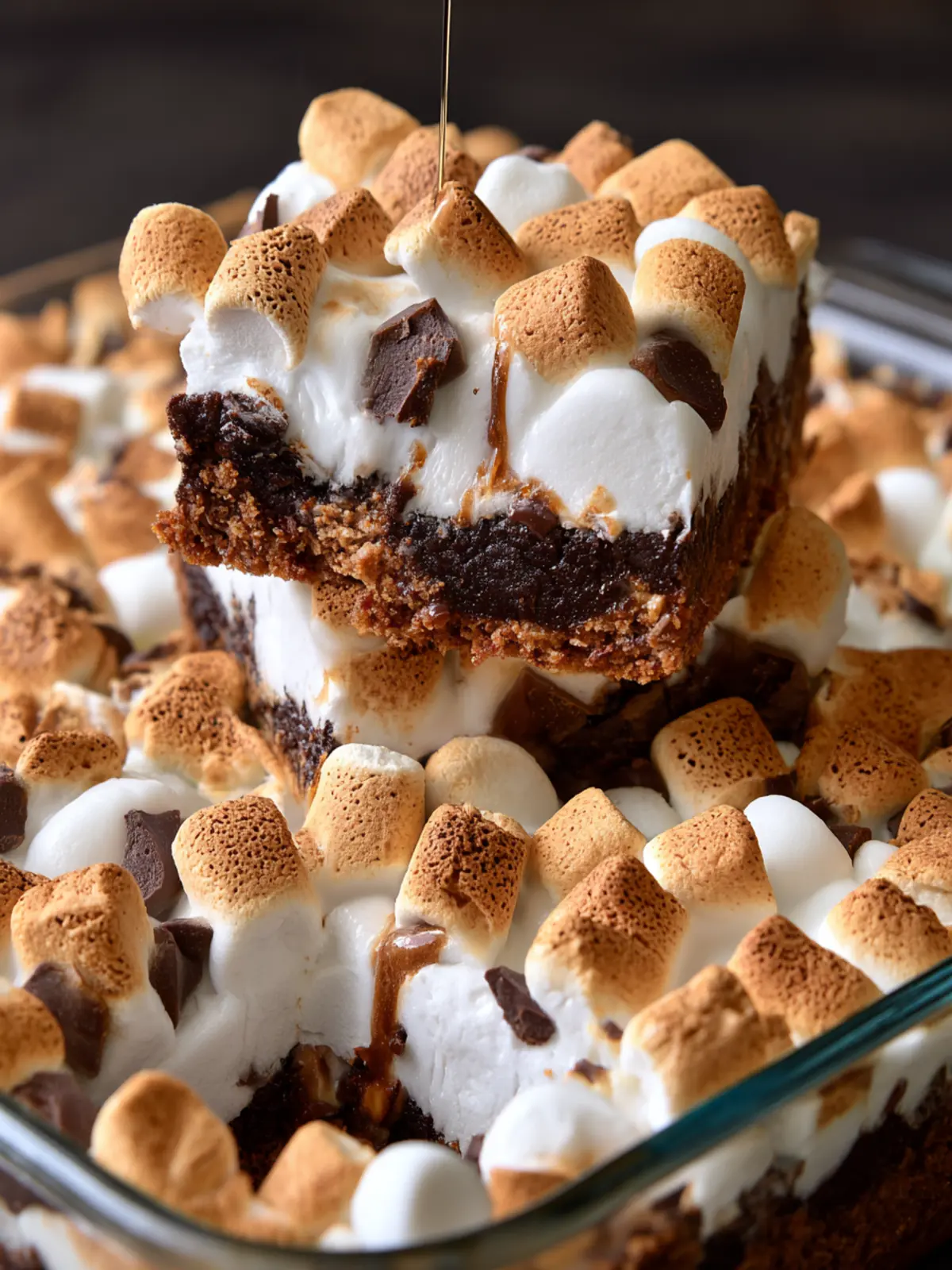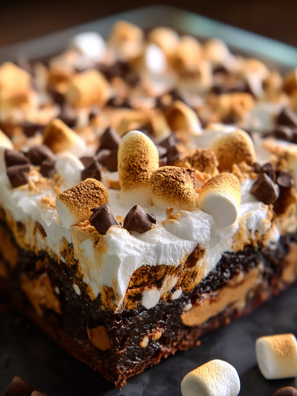Delicious brownies topped with chocolate, mini marshmallows, and graham crackers.