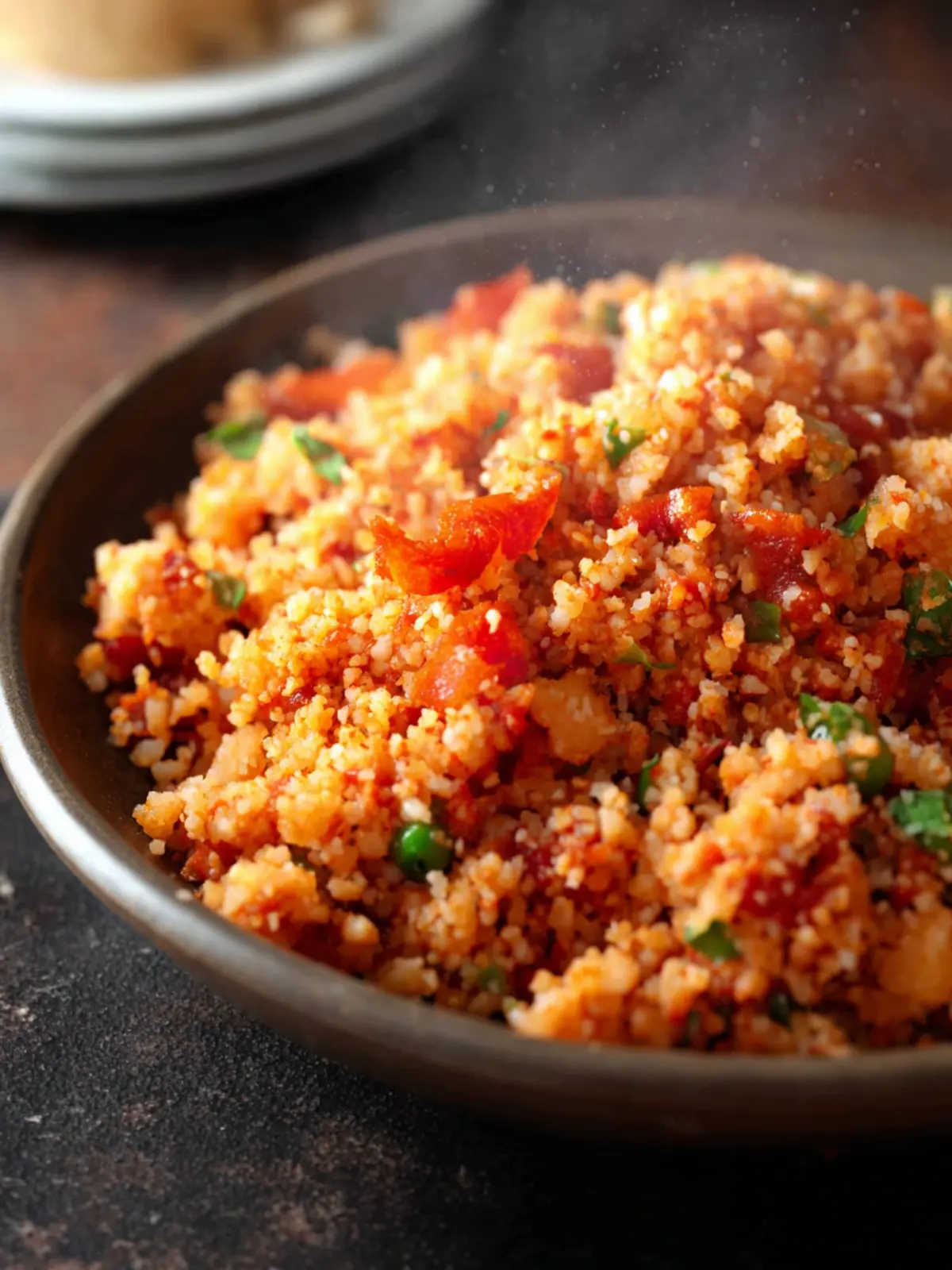 Peppers: Chopped bell peppers (red or green) not only enhance the color but also contribute a gentle sweetness and crunch, complementing the cauliflower base perfectly.