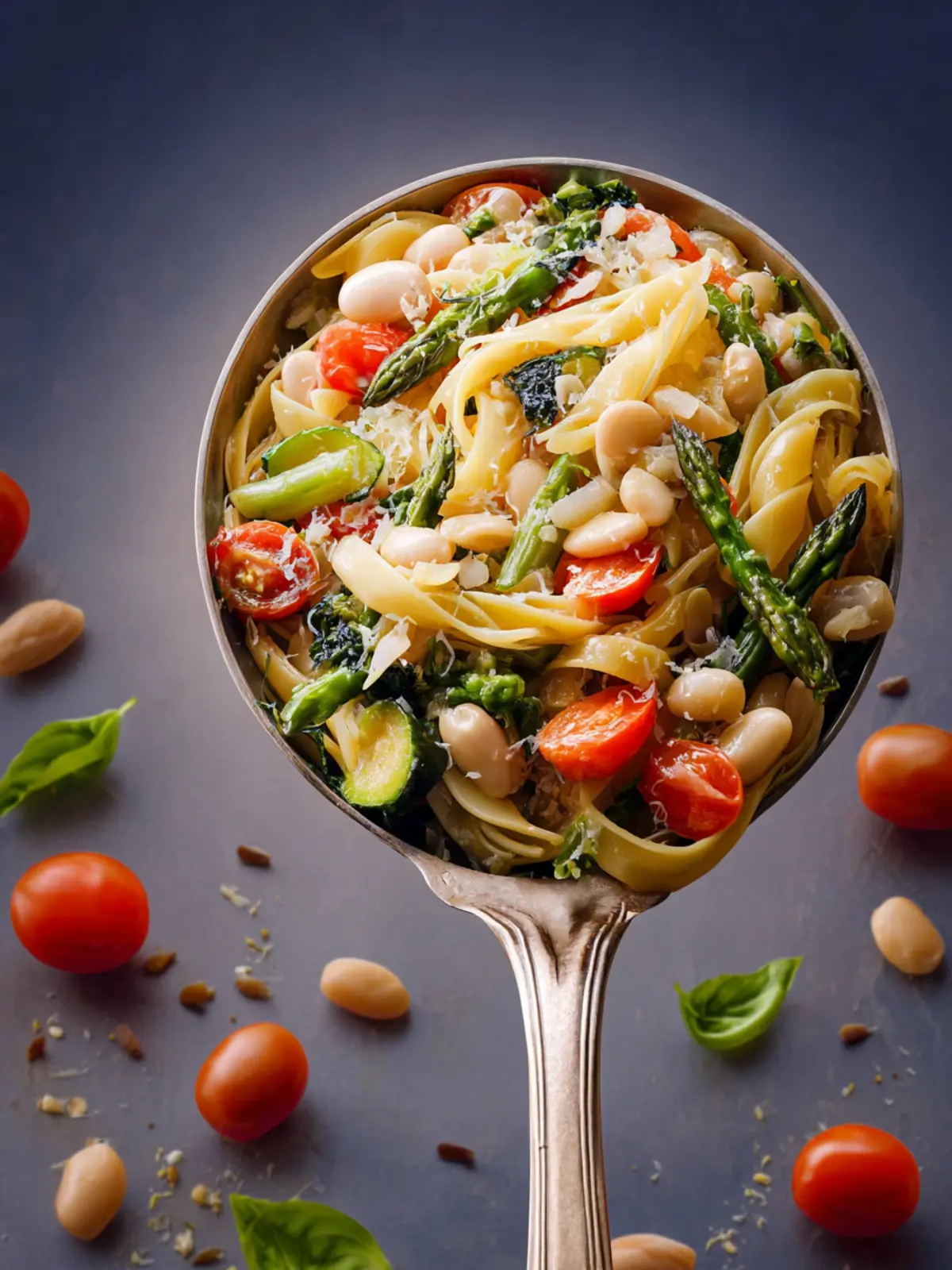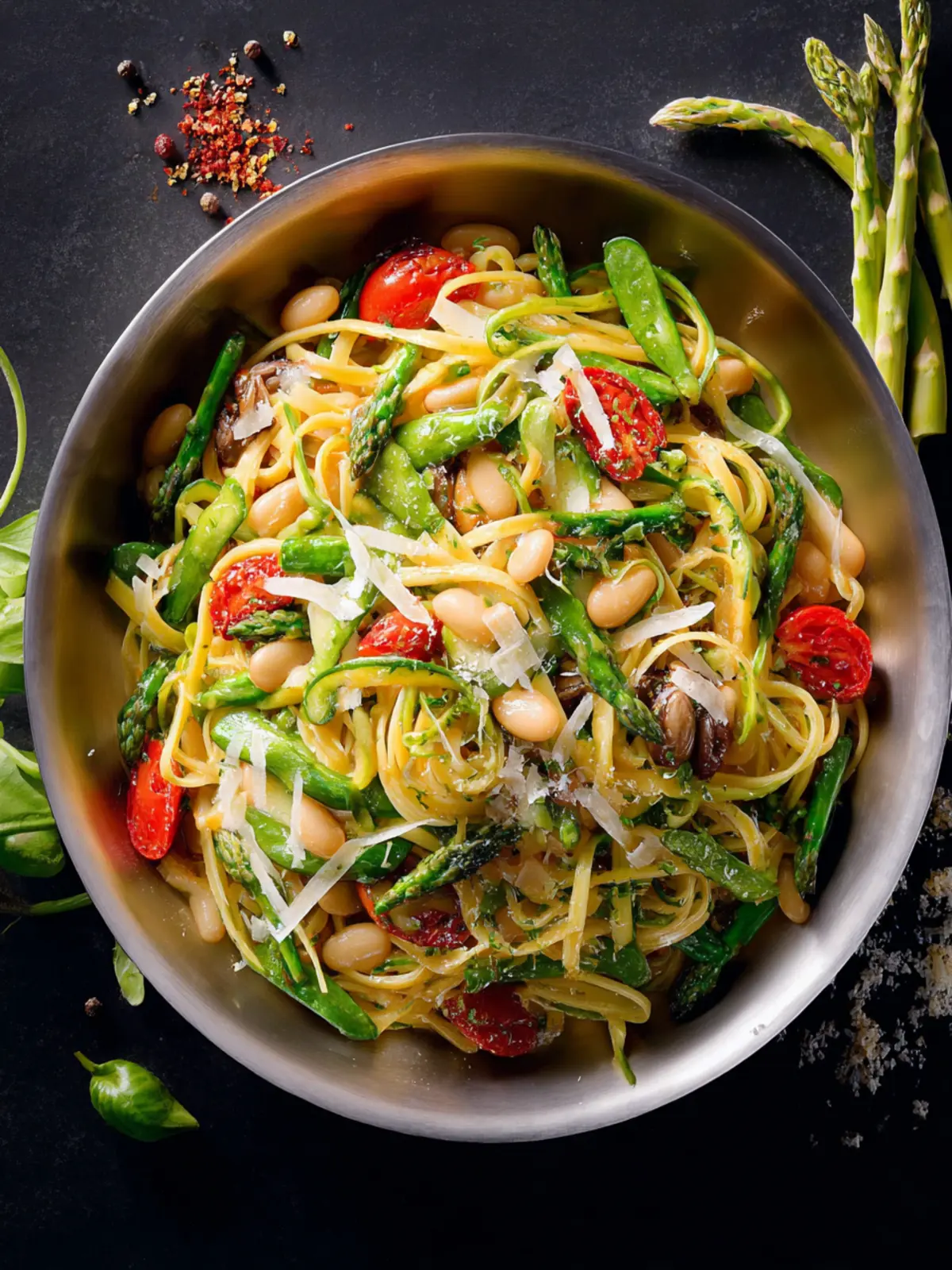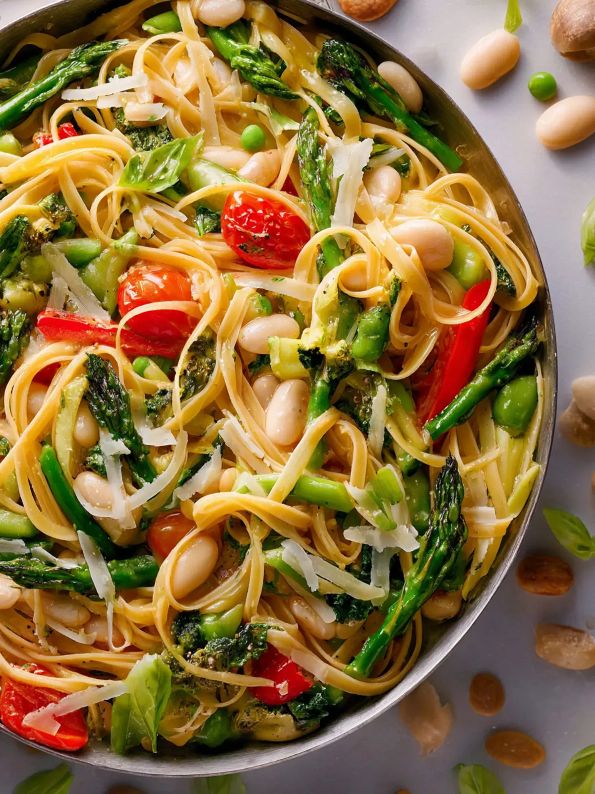 A delicious and nutritious pasta dish made with spaghettini, asparagus, and white kidney beans.